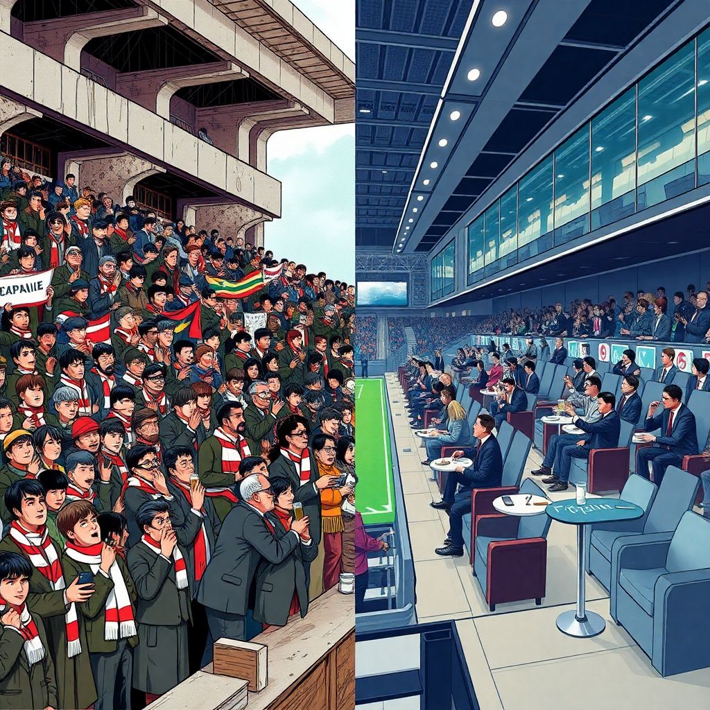 Hasta los años 80, la mayoría de clubes vivían sobre todo de tres fuentes: taquilla, socios y algo de patrocinio local. Los estadios no se pensaban como centros comerciales, sino como templos de 90 minutos. Había clases sociales en las gradas, sí, pero la distancia simbólica entre el jugador y el hincha era mucho menor: se compartía ciudad, bares, incluso problemas cotidianos. La “experiencia” del partido era ruda, a veces incómoda, pero intensamente colectiva, con una economía aún poco profesionalizada y escasa segmentación del público.